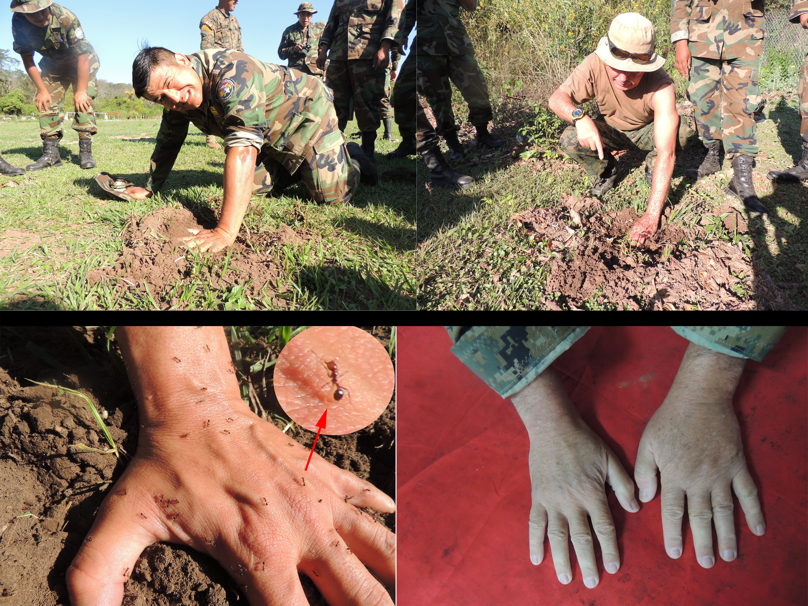 Des tests de résistance à la douleur provoquée par des morsures de fourmis terricoles du genre Solenopsis ont été inscrits dans la formation pratique. Ces tests ont un rôle éducatif car ils s’accompagnent de notions de biologie et permettent de mieux faire connaître ces insectes invasifs et les dangers qu’ils représentent pour les populations et leurs animaux domestiques en zone urbaine et péri-urbaine afin de mieux les appréhender dans leur milieu naturel. La tolérance à leurs piqûres donne aussi plus d’assurance aux instructeurs par rapport aux soldats qu’ils doivent former et cette connaissance leur assure une assise psychologique accrue. Tous les tests se font sur la base du volontariat. Par ailleurs, et c’est le point le plus important, ces expérimentations permettent de sensibiliser les personnels, y compris les personnels médicaux et infirmiers aux réactions allergiques et aux chocs anaphylactiques provoqués par les piqûres de ces fourmis agressives. L’objectif est de leur faire prendre conscience du danger que ces hyménoptères aculéates représentent pour les habitants, notamment pour les enfants, et de les sensibiliser à l’intérêt de disposer dans les dispensaires médicaux civils ou militaires d’adrénaline (épinéphrine) injectable.